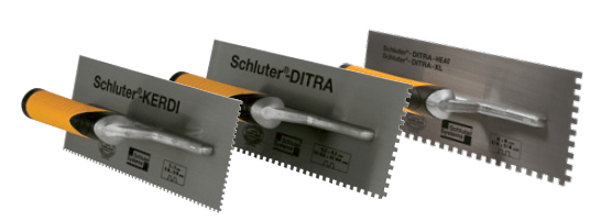 Schluter®-TROWELs: Feature square-notched designs to effectively install DITRA, KERDI, DITRA-XL, DITRAHEAT and DITRA-HEAT-DUO, respectively. DITRA-TROWEL features a 11/64″ x 11/64″ (4.5 mm x 4.5 mm) square notch. KERDI-TROWEL features a 1/8″ x 1/8″ (3 mm x 3 mm) square notch.